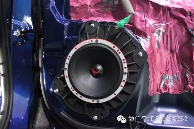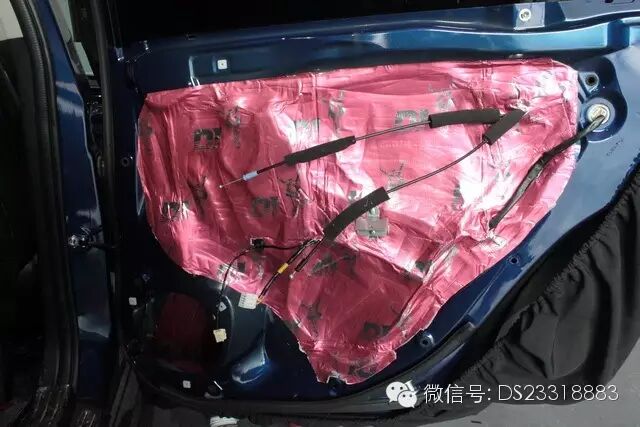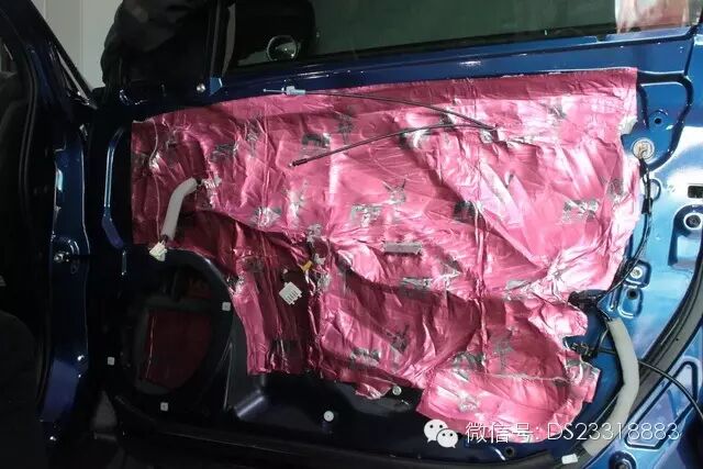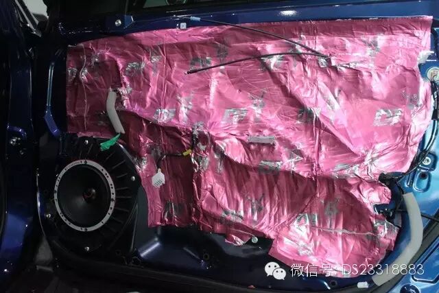 提升汽车的音响性能,一个安静的车厢环境很重要,汽车行车时一般都会产生风噪,干扰到喇叭的声音,因此在安装喇叭之前,道声先采用DJ隔音材料对车子的年前后门板做了双层隔音处理,以提升音效。